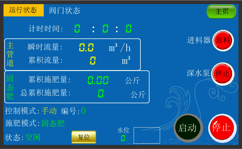 (1)施肥、控制一體化設(shè)計(jì),即可控制田間灌溉閥門(mén)控制肥、水用量;同時(shí)還可與變頻柜通訊控制水泵起停、監(jiān)測(cè)水井水位,管道壓力和流量等數(shù)據(jù)。